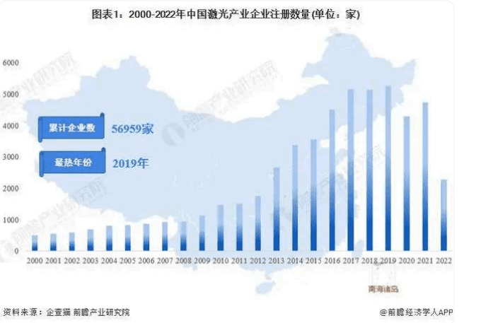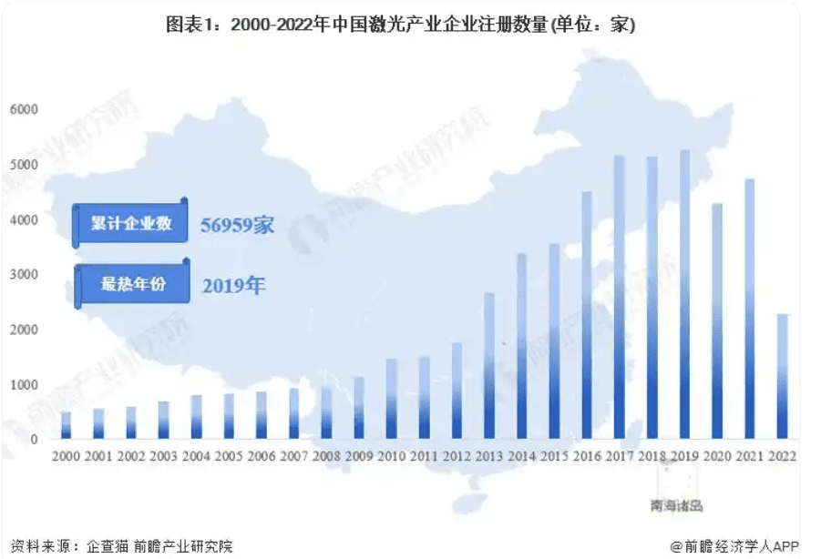 - 根据中国企业数据库企查猫,目前中国激光产业行业的主要企业共有56959家,其中以2017-2019年为主要注册热潮,2017-2019年三年新增注册企业超五千家。2021年注册企业数量为4737家,而2022年则为2284家。