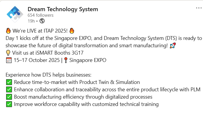 Dream Technology System (DTS) 由一群来自各行各业、相信通过提高效率、生产力和增值来帮助客户实现卓越成就的年轻企业家创立的组织。在新加坡和马来西亚运营,拥有4个办公室以支持我们的客户,已与西门子数字工业软件(SISW)、ZWSOFT、Shining 3D 和 Zortrax 建立了战略合作关系,并在该地区获得了西门子 SMART 合作伙伴认证。DTS是一站式咨询、服务和产品生命周期管理(PLM)解决方案提供商,帮助您解决业务痛点。