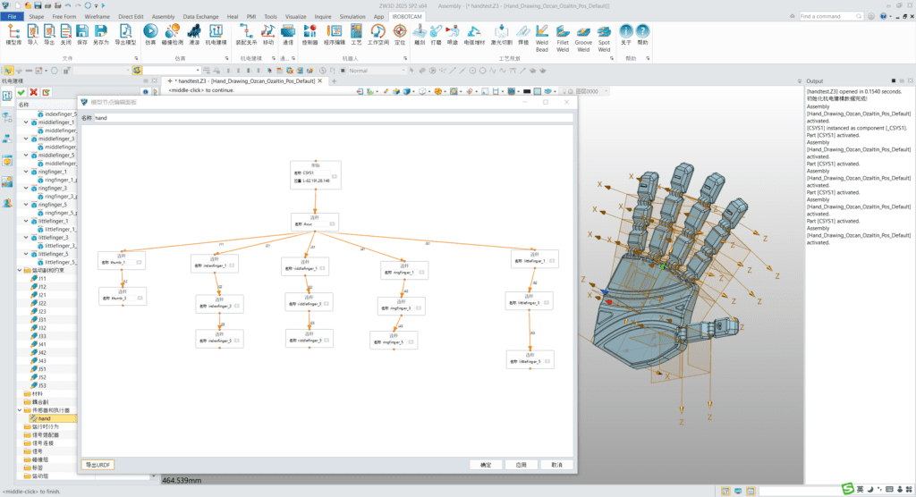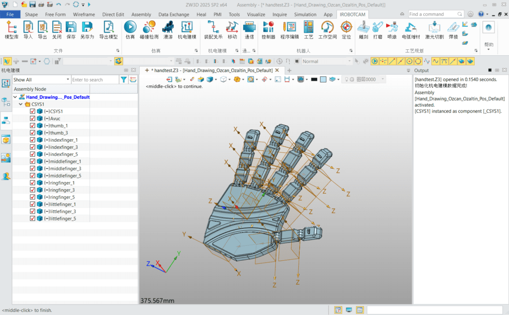 1.iRobotCAM基于三维几何内核的技术架构,可以导入来自于各个三维软件的包括Catia, Solidworks, NX, Creo, Inventor等数据格式,而利用多文件导入Solidworks或Step的灵巧手文件,可以在iRobotCAM建立灵巧手的三维结构图。