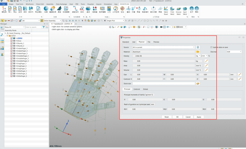 2.利用便捷的装配管理功能,可以快速的设置每个零件的材料属性,计算惯量等物理特性
